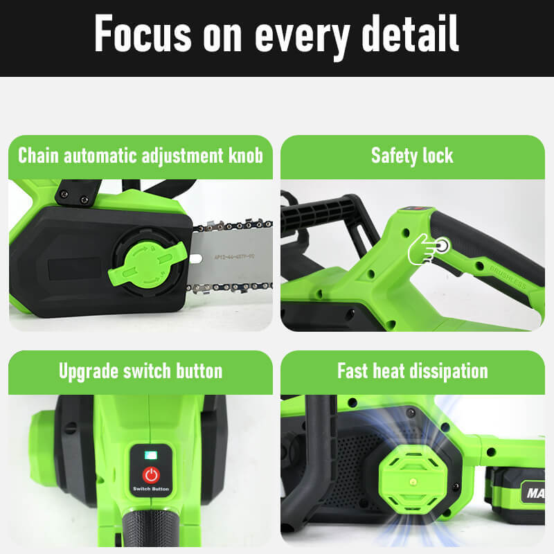 Diese 12" schnurlose Kettensäge bietet durch ihren bürstenlosen Motor, der mehr Leistung und eine längere Lebensdauer bietet als herkömmliche Motoren, eine hervorragende Leistung.Es ist für ein reibungsloses und effizientes Schneiden ausgelegt..