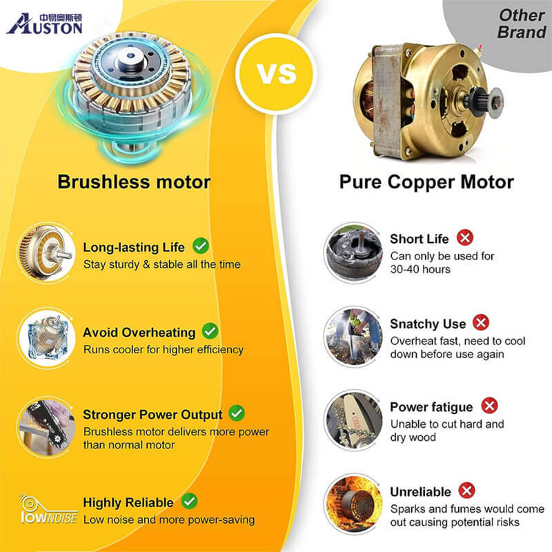 Diese 6-Zoll-Akku-Kettensäge wird von einem hocheffizienten bürstenlosen Motor angetrieben, der eine starke Schnittleistung mit geringerem Geräuschpegel und längerer Lebensdauer liefert. Sie wurde sowohl für Heim- als auch für professionelle Trimmaufgaben entwickelt und bietet einen schnellen Start und eine stabile Leistungsabgabe für saubere und glatte Schnitte.